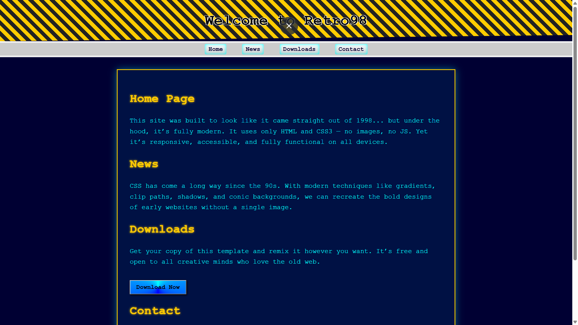 Retro98 is a pixel-perfect homage to the late-1990s web era—reimagined with modern code. This one-page, responsive template mimics the look and feel of a 1998 website using only modern CSS: think repeating backgrounds, bevel-style buttons, neon borders, and “web-safe” font choices—all without a single image. It’s quirky, nostalgic, and ready to drop into any retro-themed project or resource archive.