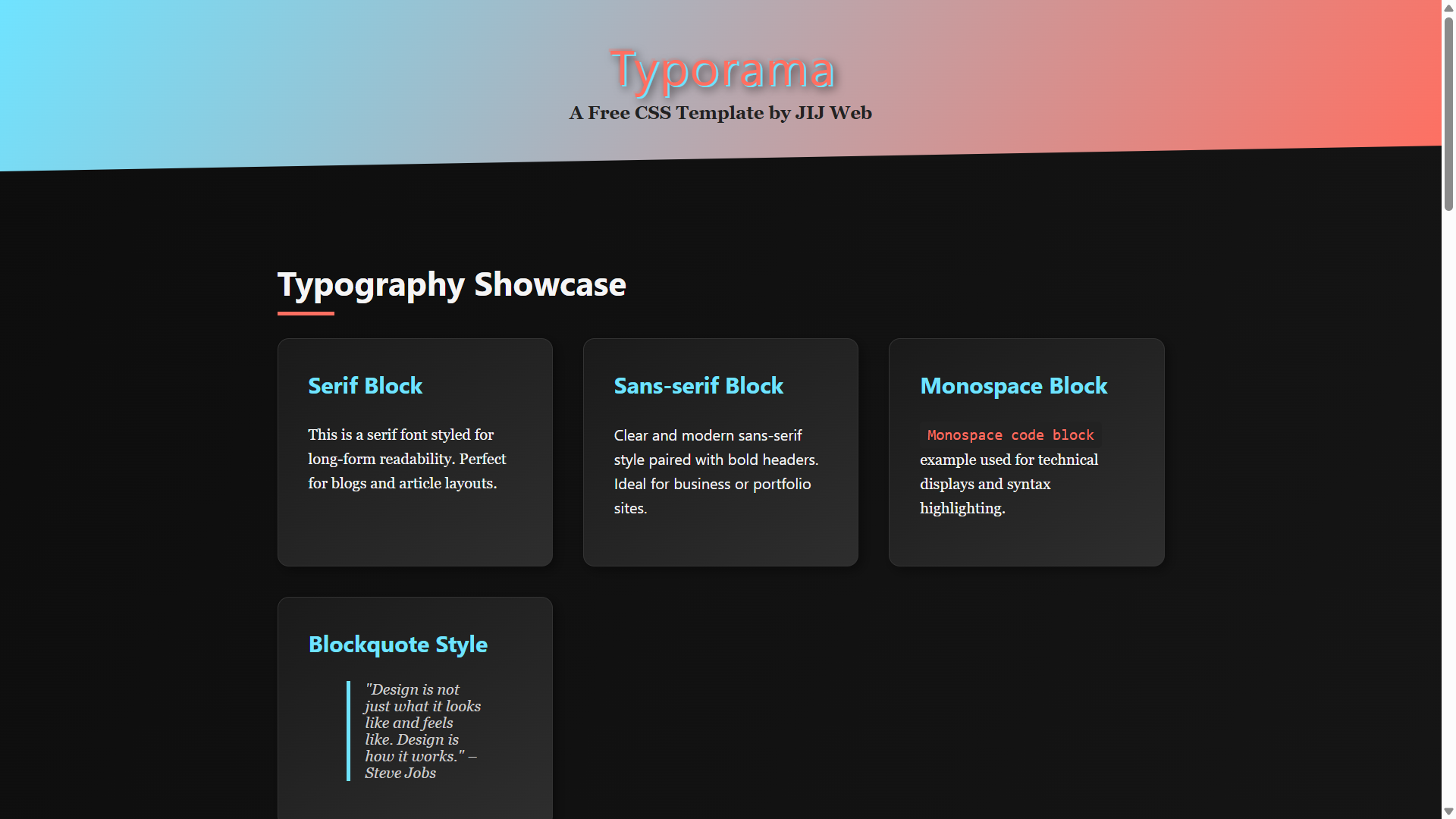 Typorama is a bold, creative one-page CSS template designed to highlight the full power of modern web typography. From gradient text and variable fonts to kinetic animations and semantic styling, Typorama is built entirely with HTML and CSS—no images, no frameworks, no JavaScript dependencies. It’s fully responsive, accessible, and perfect for designers, developers, or educators looking to demonstrate or experiment with advanced typographic techniques in a visually engaging layout.